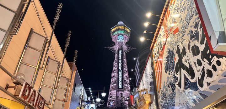 夜の通天閣はきらびやかで活気あふれる雰囲気で、「大阪にきた!」と実感しました。
