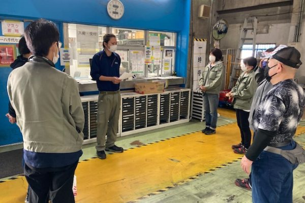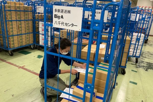 カゴ台車を所定のバース(トラックが荷物の積みおろしを行なう専用スペース)に運ぶ作業になります。